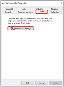 Buka Properties pada drive tersebut. Jika kapasitas terisi penuh (ditandai warna merah di Windows), lo tidak bisa menulis apa pun. Jangan lupa, ada juga kebijakan Disk Quota yang mungkin diaktifkan oleh admin. Untuk menonaktifkannya, lo cuma  perlu lakuin klik kanan drive lalu ketuk menu Properties kemudian tab Quota dan klik menu Show Quota Settings. Setelah itu, hilangkan centang Enable quota management dan klik menu Apply.